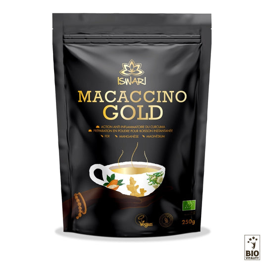 • Lemballage noir dISWARI Macaccino Gold Bio - 250g met en valeur une boisson instantanée vegan enrichie en curcuma, gingembre et cannelle. Il met laccent sur sa qualité bio et ses nutriments comme le fer et le magnésium, une boisson réconfortante.